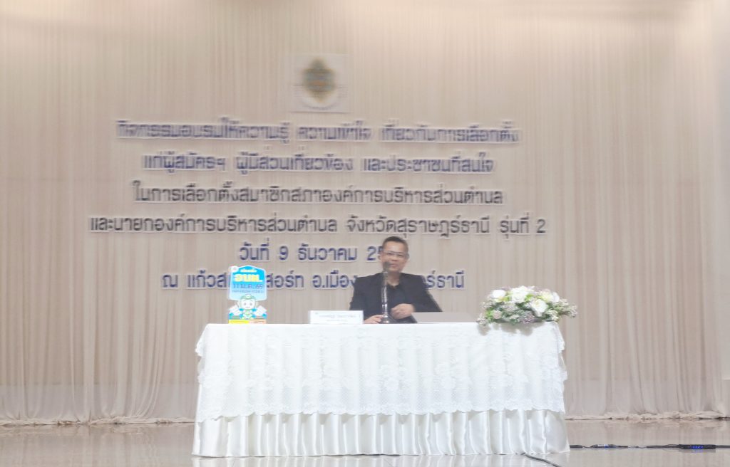 จัดกิจกรรมอบรมให้ความรู้ ความเข้าใจเกี่ยวกับการเลือกตั้งแก่ผู้สมัครฯ ผู้มีส่วนเกี่ยวข้อง และประชาชนผู้สนใจ ในการเลือกตั้งสมาชิกสภาองค์การบริหารส่วนตำบล และนายกองค์การบริหารส่วนตำบล จังหวัดสุราษฎร์ธานี