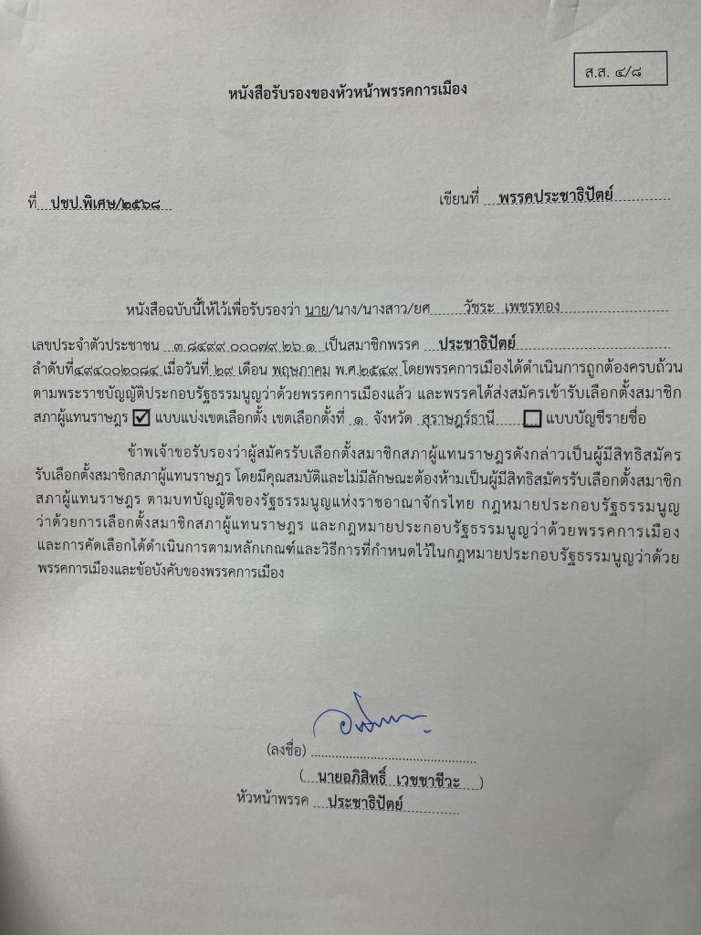 เมื่อวันที่ 24 ธันวาคม 2568 นาบอภิสิทธิ์ เวชชาชีวะหัวหน้าพรรคประชา ธิปัตย์ออกใบรับรองของหัวหน้าพรรคการเมือง (แบบส.ส.4/8) ให้นาย วัชระ เพชรทอง