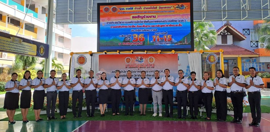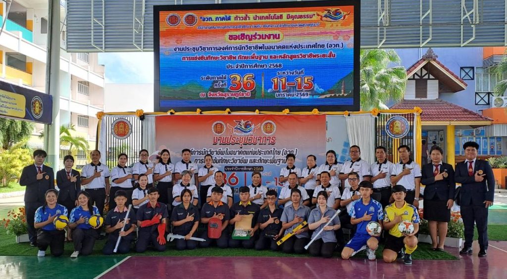 วันที่ 5 มกราคม 2569 เวลา 10.00 น.ที่ วิทยาลัยเทคนิคสุราษฎร์ธานี ดร.บัญชาลักษณ์ ลือสวัสดิ์ ผู้อำนวยการวิทยาลัยเทคนิคสุราษฎร์ธานี ประธานอาชีวศึกษาภาคใต้ นายณรงค์ หวังอีน ผู้อำนวยการวิทยาลัยการอาชีพไชยา นางสาวฉันทนา โพธิคุณประเสริฐ ผู้อำนวยการสารพัดช่างสุราษฎร์ธานี ดร.กษิดิฎฐ์ คำศรี ผู้อำนวยการวิทยาลัยเทคนิคตรัง นายวิชิต วิเชียร์ ที่ปรึกษา นางผจงกร ศรีไพโรจน์ ผู้อำนวยการวิทยาลัยเทคโนโลยีสุราษฎร์พาณิชยการ คณะอาจารย์ ครู นักเรียน และสื่อมวลชน ร่วมการแถลงข่าวการประชุมวิชาการองค์การนักวิชาชีพในอนาคตแห่งประเทศไทย (อวท.) การแข่งขันทักษะวิชาชีพ ทักษะพื้นฐาน และหลักสูตรวิชาชีพระยะสั้น ประจำปีการศึกษา 2568 ระดับภาคใต้ ครั้งที่ 36 ณ จังหวัดสุราษฎร์ธานี