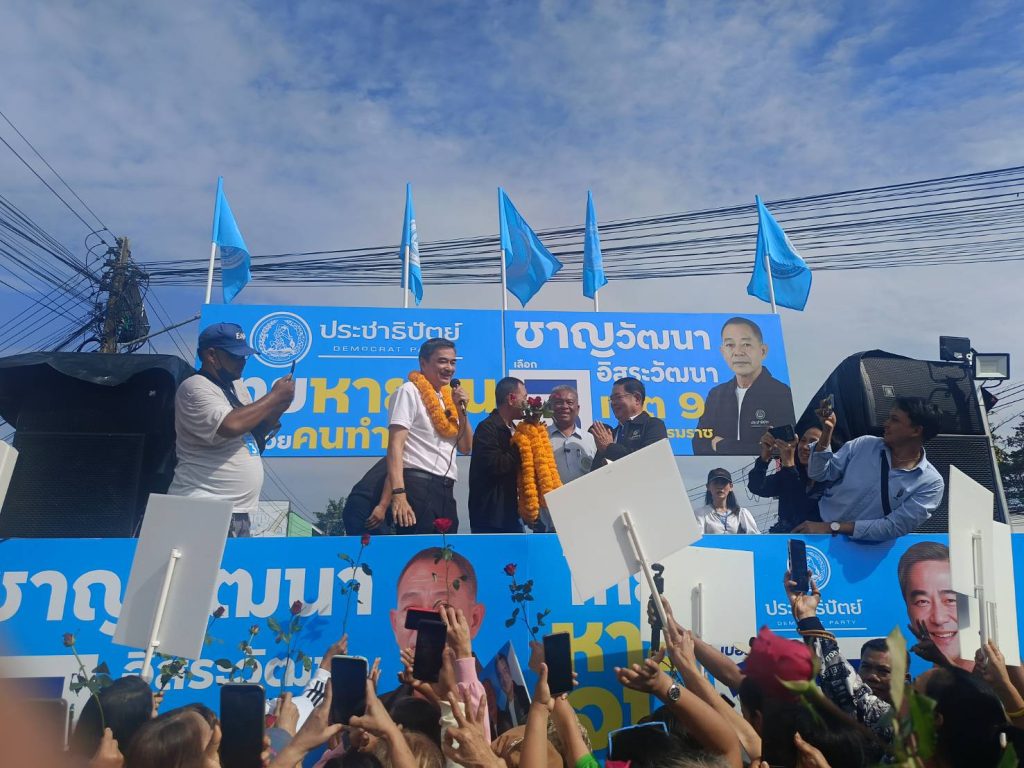 คนที่โดนหลอกโดยสแกมเมอร์ปีหนึ่งเงินสูญไม่รู้เท่าไหร่ ถามว่าในช่วงนี้ทำกันอยู่แถวไหน อยู่รอบ ๆ ประเทศไทย ที่ผ่านมารัฐบาลไทยปราบสแกมเมอร์ช้าตลอด มีศูนย์หลอกลวงอยู่ชายแดนเมียนม่า ในที่สุดจีนต้องส่งรัฐมนตรีมาบัญชาการ ที่กัมพูชาถ้าไม่รบกันก็ไม่รู้จะเข้าไปทลายแหล่งหลอกลวงทั้งหลาย ที่สำคัญหลอกเงินพี่น้องไปแล้วเอาเงินเข้ามาอยู่ในระบบการเงินไทยหมด ตลาดหุ้น ตลาดทุน และตอนนี้ที่น่ากลัวกำลังไหลเข้ามาสู่พรรคการเมืองแล้วพรรคการเมืองก็เอาเงินมาซื้ออำนาจ เพราะฉะนั้นวันที่ 8 กุมภา เงินสีอะไรก็ไม่รู้ละที่จะลงมาซื้อพวกเราได้ไหม อย่าให้ซื้อนะครับ ซื้อไปแล้วเข้าไปนั่งเป็นรัฐมนตรี เป็น สส. แล้วจะปราบของพวกนี้ได้อย่างไร และเมื่อไหร่ชาวโลกจะเชื่อมั่นประเทศไทย จากนั้นนายอภิสิทธิ์เดินทางไปหาเสียงตามจุดต่างๆในจังหวัดนครศรีธรรมราช.