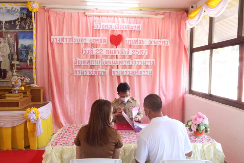 วันที่ 22 กุมภาพันธ์ 2567 เวลาประมาณ 10.00 น. นายจักรกฤษณ์ ฝั่งชลจิตร์ นายอำเภอเมืองนครศรี ธรรมราช มอบหมายให้นายชัยอนันต์ บุญประเสริฐ ปลัดอำเภอเมืองนครศรี ธรรมราช และเจ้าหน้าที่สำนักทะ เบียนอำเภอเมืองนครศรีธรรมราช จดทะเบียนสมรสนอกสำนักทะเบียน ณ ทัณฑสถานวัยหนุ่มนครศรี ธรรมราช