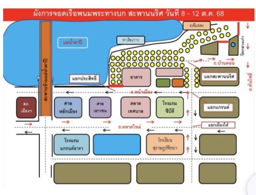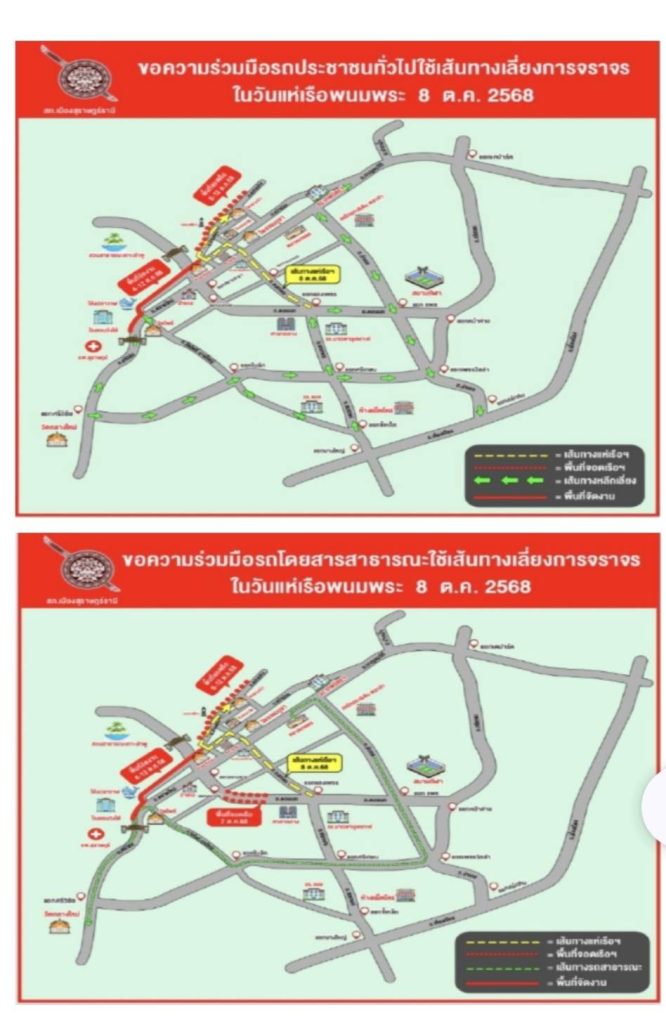 8. วันที่ 8 ตุลาคม 2568 เวลา 07.30 น. ประชาสัมพันธ์พี่น้องประชาชน ห้ามจอดรถในเส้นทางการเคลื่อนเรือพนมพระเข้าจอด บริเวณสะพานนริศ ถนนชนเกษม ถนนหน้าเมือง ถนนปรีดาราษฎร์ ถนนบ้านดอน ถนนตลาดล่าง
