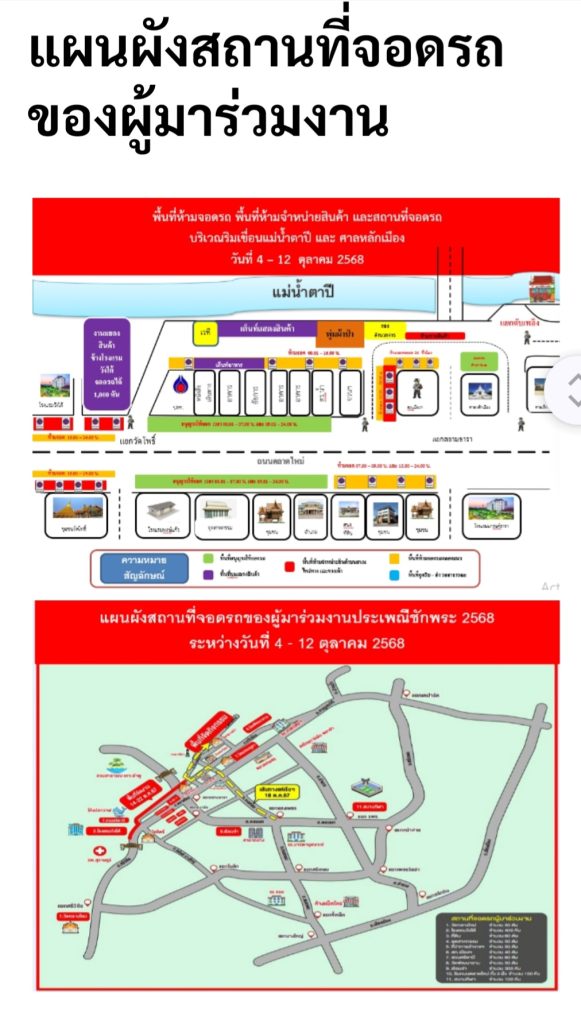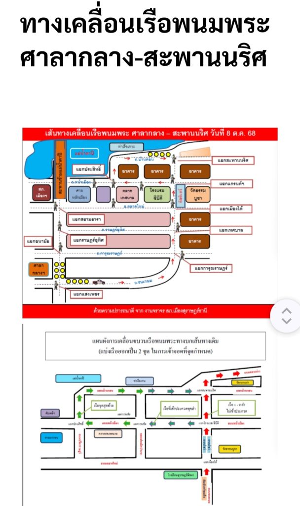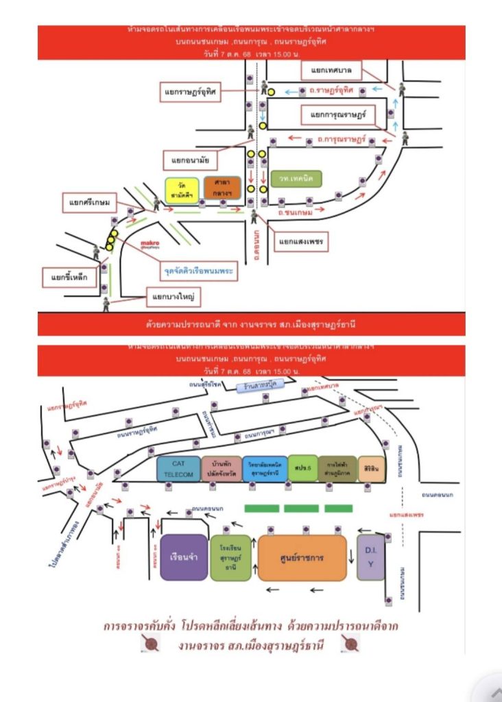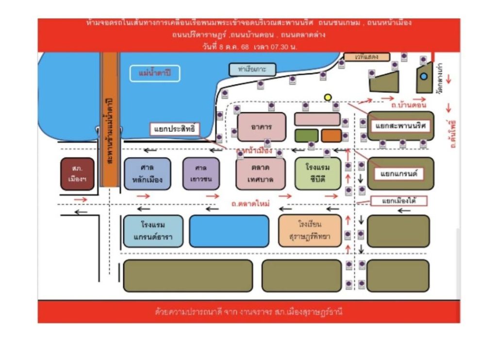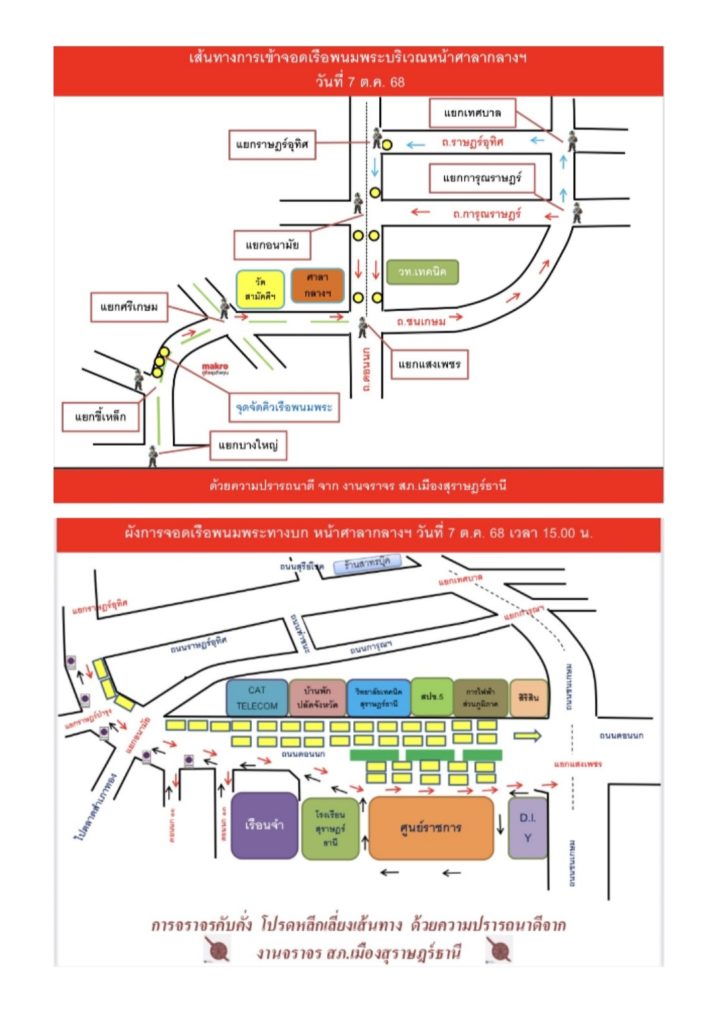 7. วันที่ 7 ตุลาคม 2568 เวลา 15.00 น. ประชาสัมพันธ์พี่น้องประชาชน ห้ามจอดรถในเส้นทางการเคลื่อนเรือพนมพระเข้าจอด บริเวณหน้าศาลากลางจังหวัดสุราษฎร์ธานี ถนนชนเกษม ถนนการุณราษฎร์ ถนนราษฎร์อุทิศ