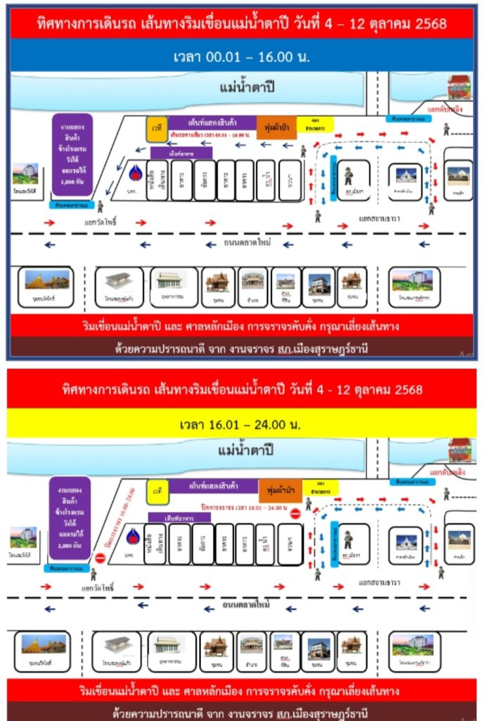 1. ระหว่างวันที่ 4 – 12 ตุลาคม 2568 ทิศทางการเดินรถ เส้นทางริมเขื่อนแม่น้ำตาปี เวลา 00.01–16.00 น. เวลา 16.01-24.00 น.
