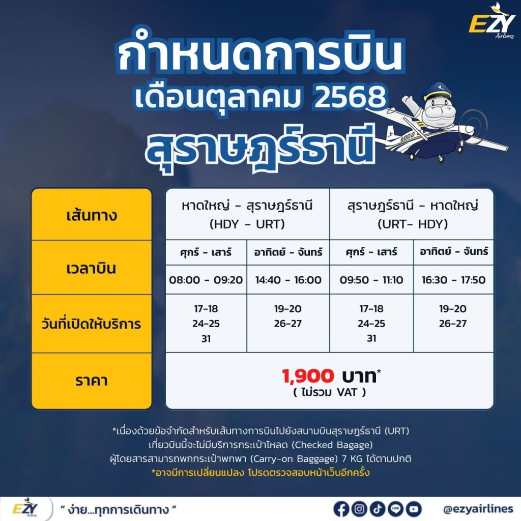 ทั้งนี้ สายการบินอีซีแอร์ไลน์ (EZY Airlines) พร้อมให้บริการเที่ยวบินแบบประจำ (Schedule Fight) เส้นทาง “หาดใหญ่ – สุราษฎร์ธานี” 4 เที่ยวบินต่อสัปดาห์ ในทุกวันศุกร์ – วันจันทร์ ด้วยเครื่องบิน Cessกa 208B Grand Caravan Ex ซึ่งรองรับผู้โดยสารได้ 12 ที่นั่ง ใช้เวลาแค่ 1 ชั่วโมง 20 นาที