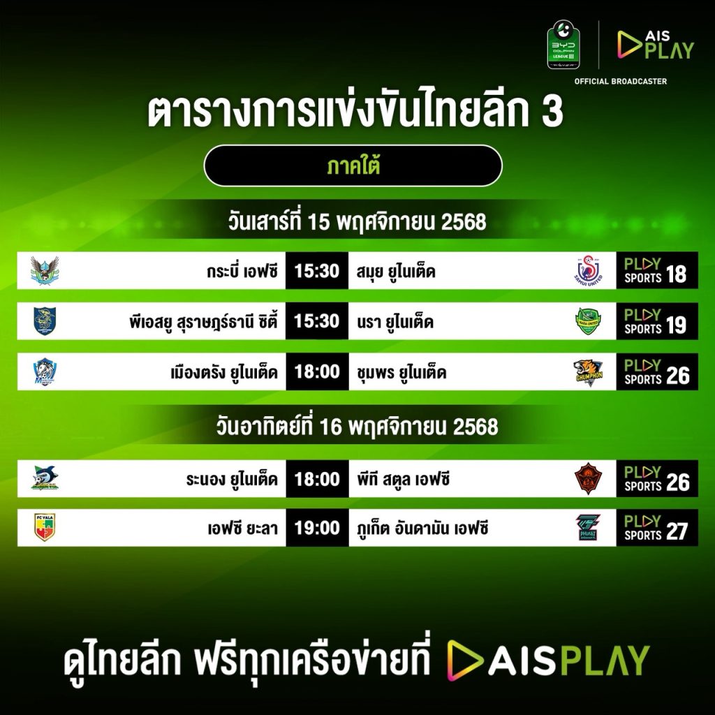 ลงไปที่โซนภาคใต้ที่กลับมาหวดกันอีกครั้งหลังพักไปสัปดาห์ก่อน เกมน่าสนใจในสัปดาห์นี้คงหนีไม่พ้นการพบกันระหว่าง “ตะพัดพิฆาต” พีเอสยู สุราษฎร์ธานี ซิตี้ ทีมอันดับ 4 ของตาราง ที่จะเปิดบ้านรับการมาเยือนของ “เรือกอและพิฆาต” นรา ยูไนเต็ด จ่าฝูงของโซน ที่สนามม.สงขลานครินทร์ วิทยาเขตสุราษฎร์ธานี ในวันเสาร์ที่ 15 พฤศจิกายน 2568 เวลา 15.30 น. ถ่ายทอดสดทาง AIS PLAY SPORTS19