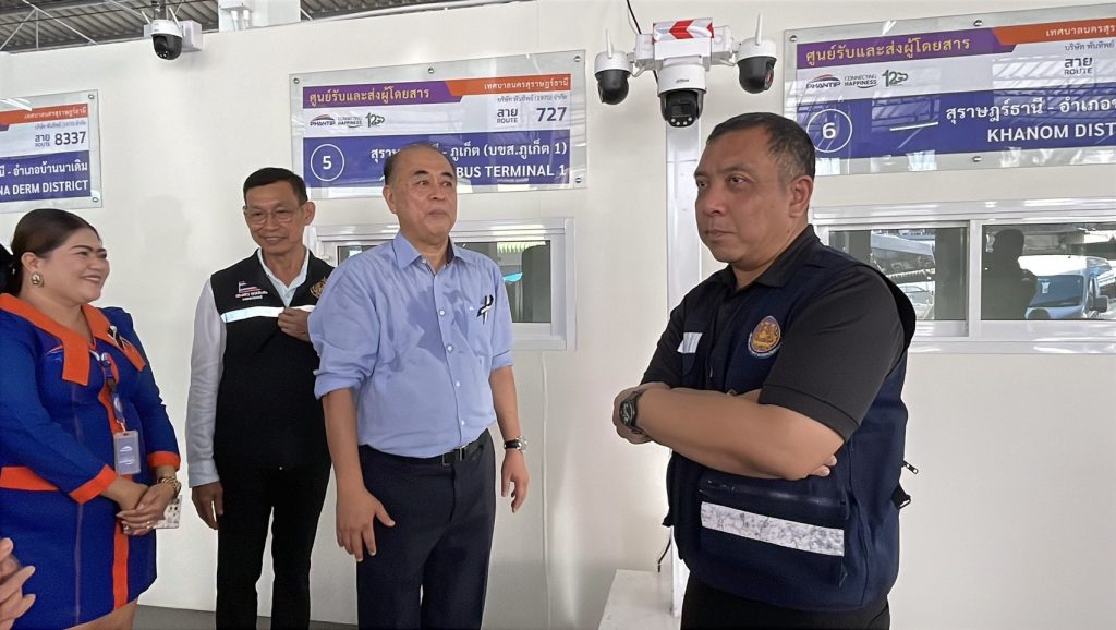 ภายหลังจากนั้นผู้ว่าราชการจังหวัดสุราษฎร์ธานีได้ไปตรวจเยี่ยมสถานีขนส่งผู้โดยสารตลาดเกษตรสองและมอบของที่ระลึกให้แก่ผู้เดินทาง พร้อมตรวจเยี่ยมพนักงานขับรถของบริษัทพันธุ์ทิพย์ เป็นผู้รับสัมปทานการเดินรถระหว่างสุราษฏร์ธานีไปยังจังหวัดต่างๆ ทั้งนี้ยังมีการตรวจวัดแอกอฮอร์ ตรวจปัสสาวะเพื่อหาสารเสพติดในพนักงานขับรถเป็นการป้องกันอุบัติเหตุทางถนน สร้างความเชื่อมั่นให้กับผู้โดยสารที่จะเดินทางกลับภูมิลำเนาด้วยความปลอดภัย