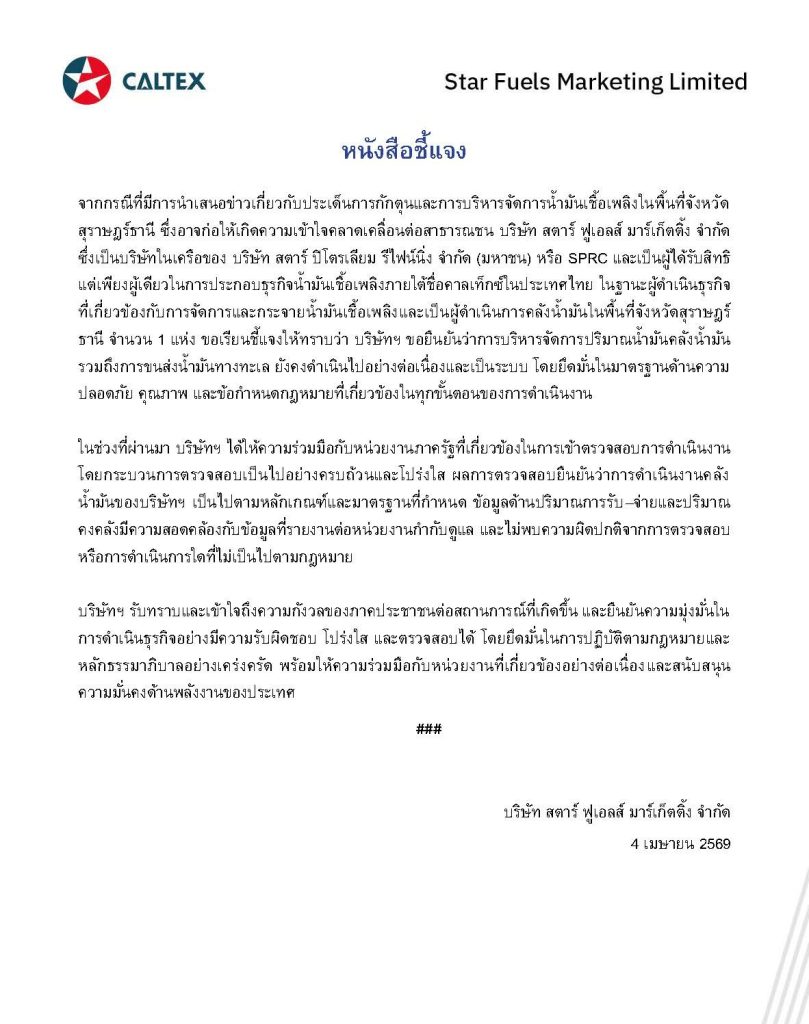 จากกรณีที่มีการนำเสนอข่าวเกี่ยวกับประเด็นการกักตุนและการบริหารจัดการน้ำมันเชื้อเพลิงในพื้นที่จังหวัด สุราษฎร์ธานี ซึ่งอาจก่อให้เกิดความเข้าใจคลาดเคลื่อนต่อสาธารณชน บริษัท สตาร์ ฟูเอลส์ มาร์เก็ตติ้ง จำกัด ซึ่งเป็นบริษัทในเครือของ บริษัท สตาร์ ปิโตรเลียม รีไฟน์นิ่ง จำกัด (มหาชน) หรือ SPRC และเป็นผู้ได้รับสิทธิแต่เพียงผู้เดียวในการประกอบธุรกิจน้ำมันเชื้อเพลิงภายใต้ชื่อคาลเท็กซ์ในประเทศไทย ในฐานะผู้ดำเนินธุรกิจที่เกี่ยวข้องกับการจัดการและกระจายน้ำมันเชื้อเพลิงและเป็นผู้ดำเนินการคลังน้ำมันในพื้นที่จังหวัดสุราษฎร์ธานี จำนวน 1 แห่ง ขอเรียนชี้แจงให้ทราบว่า บริษัทฯ ขอยืนยันว่าการบริหารจัดการปริมาณน้ำมันคลังน้ำมัน รวมถึงการขนส่งน้ำมันทางทะเล ยังคงดำเนินไปอย่างต่อเนื่องและเป็นระบบ โดยยึดมั่นในมาตรฐานด้านความปลอดภัย คุณภาพ และข้อกำหนดกฎหมายที่เกี่ยวข้องในทุกขั้นตอนของการดำเนินงาน